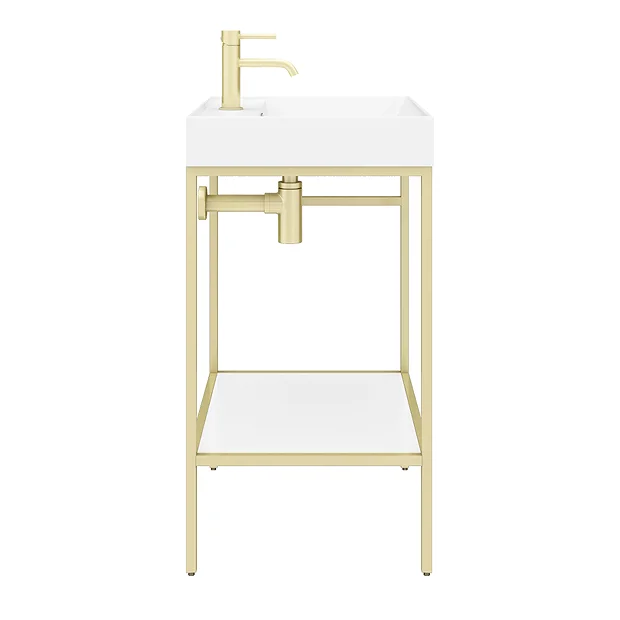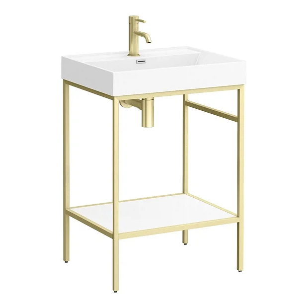 Arezzo 605 Brushed Brass Framed Washstand with Gloss White Open Shelf and Polymarble Basin
