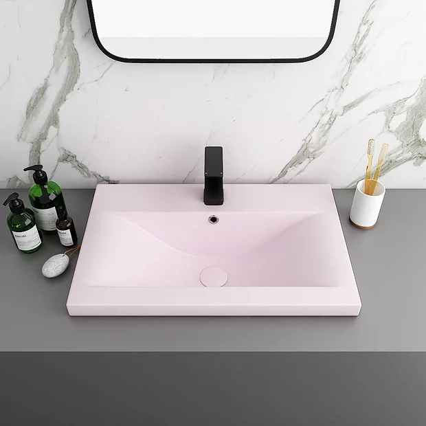 The eye catching luxury Arezzo matt pink coloured inset basin with one tap hole has a stylish contemporary rectangular shape, perfect for creating a boutique feel in your bathroom. Designed to be mounted onto a worktop console or vanity unit. Manufactured from high quality vitreous china with a matt pastel pink finish. Some small dimensional variation may occur due to manufacturing tolerances. Waste not included.