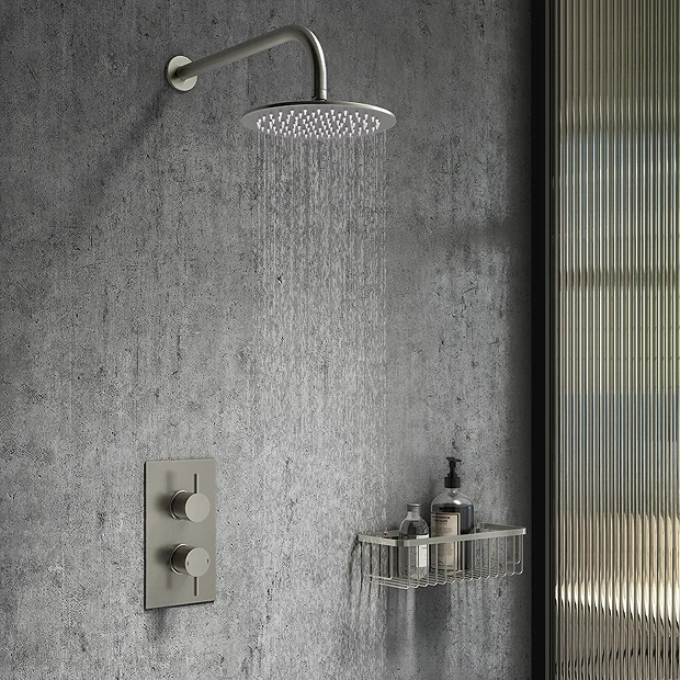 This Arezzo round concealed thermostatic valve features a quality brushed gunmetal grey finish with round tap heads, perfect for creating an eye catching look in your bathroom. Offers thermostatic showering via two easy-to-operate controls for temperature and flow. The valve body comes with a contemporary square face plate and has been constructed from solid brass. Supplied with matching wall mounted 200mm round fixed shower head with swivel joint and arm.
