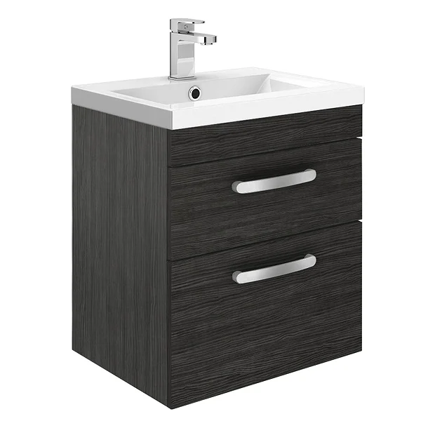 The Brooklyn Black Woodgrain modular furniture range combines up to date looks with practical storage. Features 2 soft close drawers and provides plenty of storage space for toiletries, the Brooklyn wall hung vanity unit is perfect for adding modern style to any bathroom. This high quality Black Woodgrain textured wood effect vanity unit is supplied with a smooth white gloss vitreous china basin. All units are provided with quality matt chrome handles.