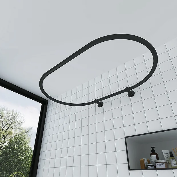 Looking for a practical oval enclosure to accompany your freestanding bath? The Traditional Matt Black Oval Shower Curtain Rail is just the thing to keep splashes and drips at bay. Manufactured from hardwearing steel, the tubing of this reliable rail easily supports the weight of a shower curtain, keeping your floor clean and dry. Designed for wall mounting, this matt black shower curtain rail connects securely to the wall with two traditional style ball joints and flanges. Helpfully, all fixings are included, so you should have it assembled in next to no time.