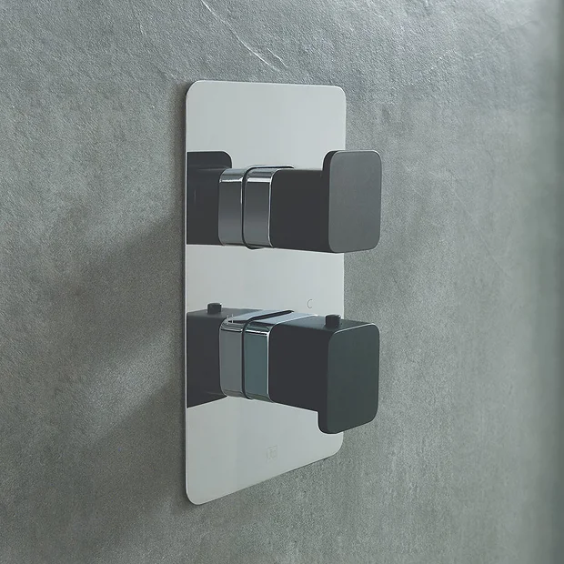 With its polished chrome surface and sleek matt black lever handles, the Axel concealed shower valve features a sophisticated and stunning design that creates a centrepiece in any bathroom. This thermostatic concealed shower valve controls a single outlet such as a fixed shower head or handset and features separate controls for flow and temperature that makes it easy to use. The thermostatic valve ensures safe showering and constant temperature.