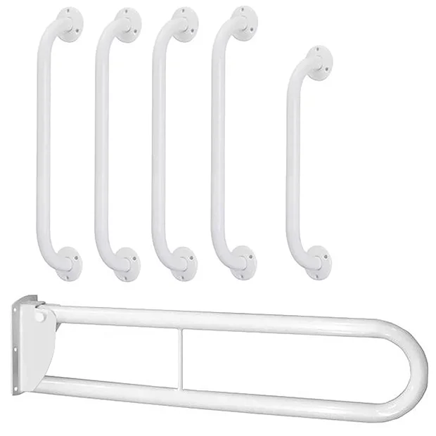 A quality set of DOC M grab rails constructed from durable steel with a white gloss finish. Each rail has a diameter of 35mm and comes supplied with fixings. The set consists of 1 x 760mm drop down rail. 4 x 600mm straight grab rails and 1 x 450mm straight grab rail. The hinged arm locks in the upright position when not required.