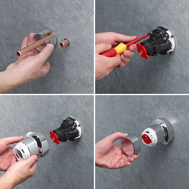 - Front of tile installation system allows connection to pipework during second phase fix after tiling is complete