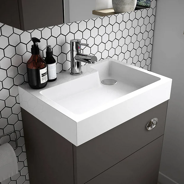 An ideal space saving solution for en-suites and cloakrooms, this 2-in-1 combined wash basin and wc unit utilises the smallest of spaces and creates more space in your bathroom. Made from high quality materials with a stunning sleek gloss grey finish, it compliments any modern bathroom to create a designer look. Comes with a single tap hole Polymarble basin top and dual flush cistern.