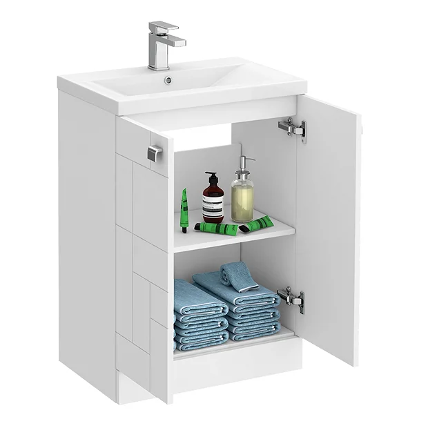 The Venice Abstract 600mm White 2-Door Floor Standing Vanity Unit features an eye-catching geometric design that will create a style statement in your bathroom. It has ample storage with soft-closing cupboard doors and an internal shelf to keep your toiletries organised. A ceramic basin slots perfectly on top and all pipework is neatly concealed within the unit. Manufactured from quality materials, this vanity unit comes fully assembled and is finished in white satin.